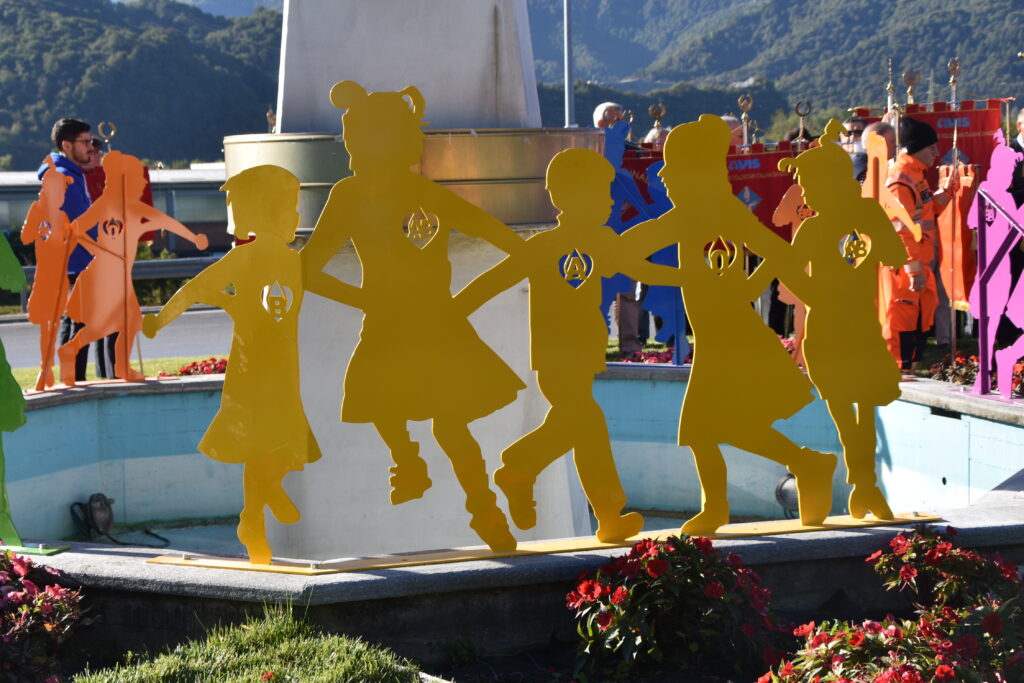 La rotatoria è stata abbellita, partendo da un’idea del vice presidente Piero Morano, con un’installazione permanente: un girotondo di bambini che si tengono per mano, dipinti con i colori dell’arcobaleno e con un cuore che rappresenta i diversi gruppi sanguigni.
