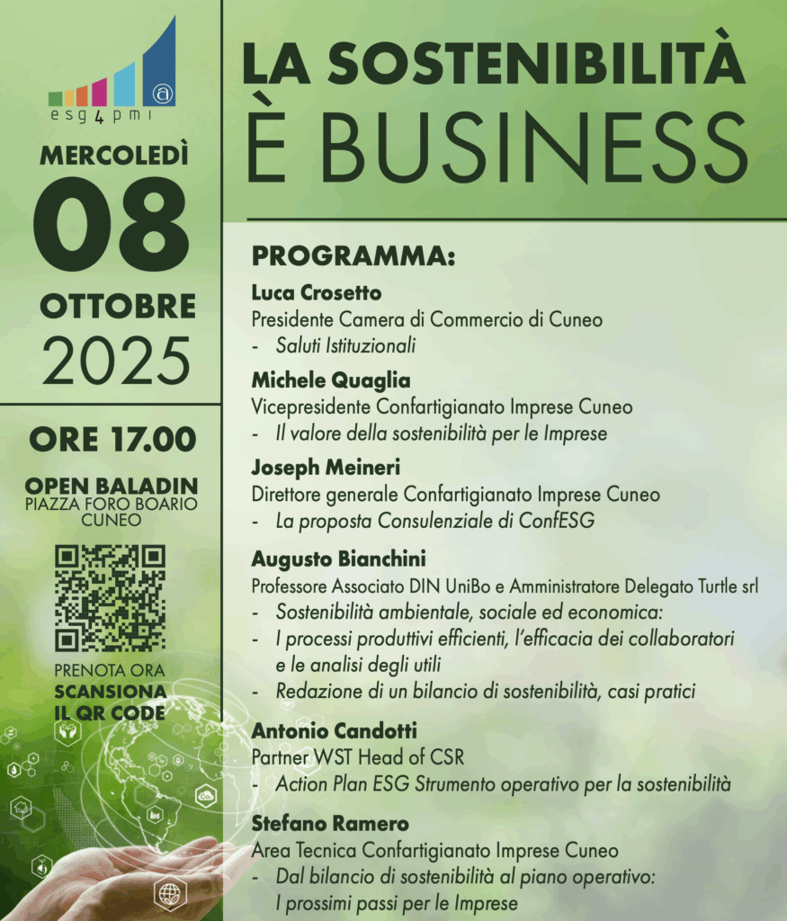 “Il nostro obiettivo – conclude Quaglia – è mettere in rete conoscenze ed esperienze, favorire il dialogo tra mondo accademico, associativo e imprenditoriale, e fornire alle aziende associate strumenti concreti. Solo così la sostenibilità potrà tradursi da concetto astratto a business reale, con ricadute positive sul piano economico, sociale e ambientale per tutto il territorio cuneese”. L’iniziativa, realizzata in collaborazione con ConfESG e Studio WST, è realizzata con il contributo della Camera di Commercio di Cuneo.