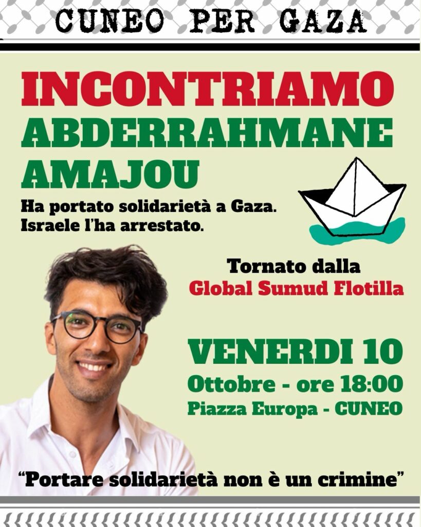 Nel pomeriggio di oggi (venerdì 10 ottobre) il presidio Cuneo per Gaza in Piazza Europa accoglie Abderrahmane Amajou, braidese, attivista e presidente nazionale di ActionAid Italia, da poco rientrato in Italia dopo la detenzione in Israele.