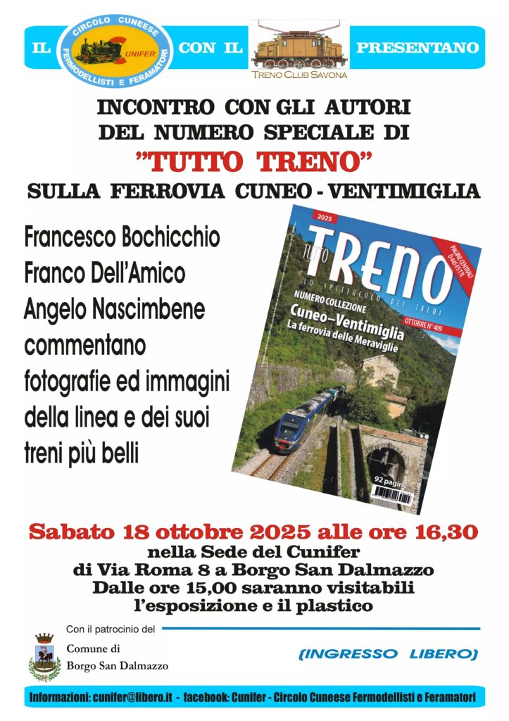 Sabato 18 ottobre, ore 16.30, presso la sede del Circolo Cuneese Fermodellisti e Feramatori (Cunifer) in via Roma 8 a Borgo San Dalmazzo (ex mulino Gione), si terrà un incontro pubblico con gli autori del numero speciale della rivista “Tutto Treno” dedicato alla ferrovia Cuneo-Ventimiglia.