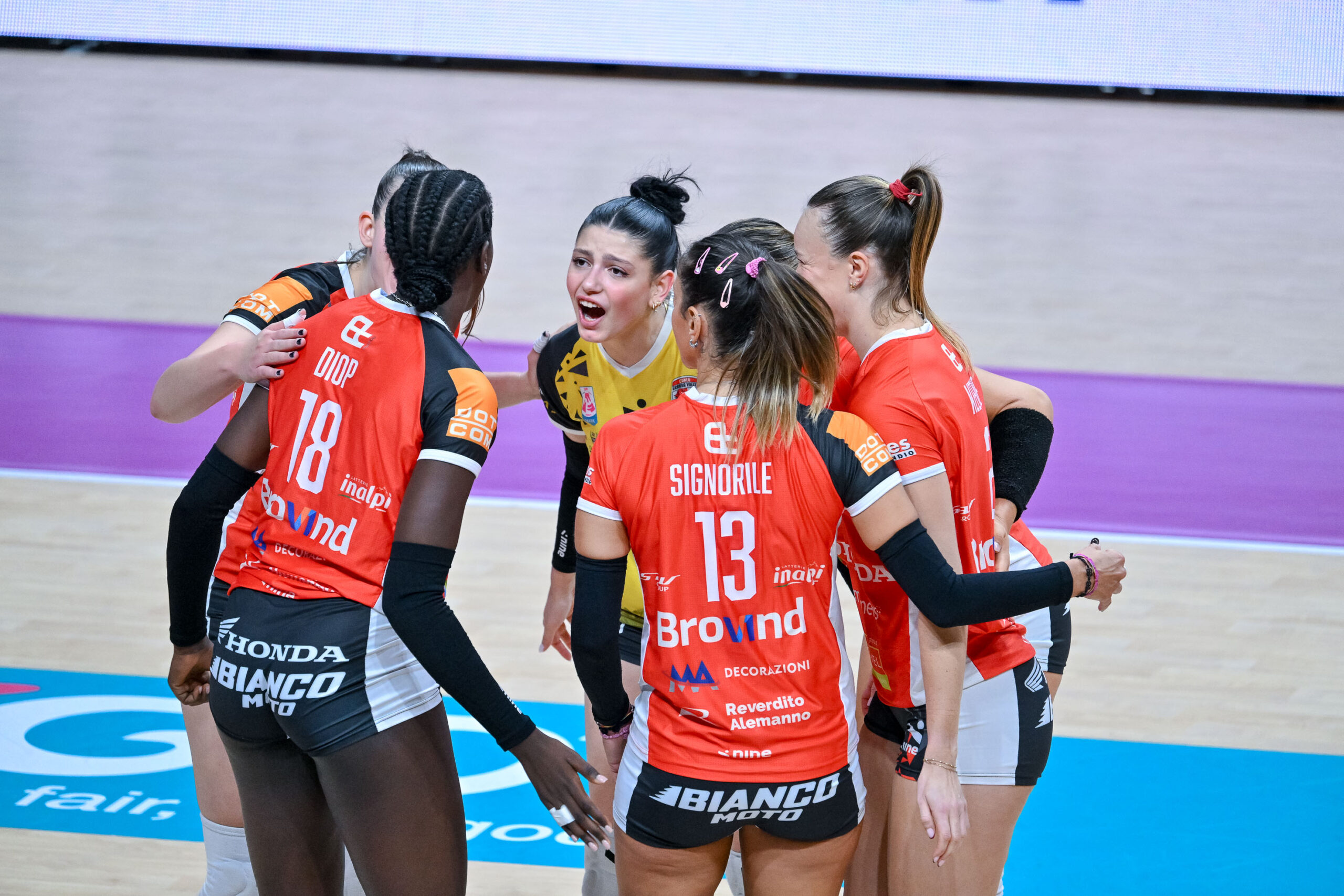 Coach Salvagni replica con: Signorile al palleggio, Diop opposta, Cecconello e Keene al centro, Pritchard e Pucelj schiacciatrici, Bardarlo libero.