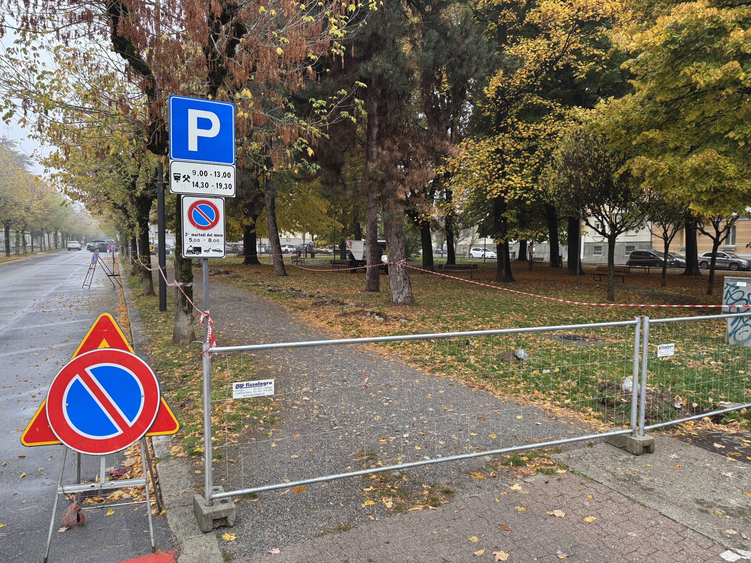 Procedono a Cuneo i lavori per la sistemazione di piazza del Cottolengo, su cui si sta realizzando una pavimentazione in materiale drenante dei camminamenti che circondano il giardino, oggi sterrati.