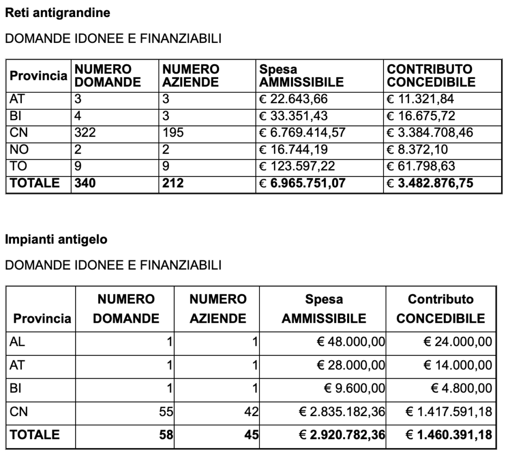 Come spiega l’assessore regionale all’agricoltura Paolo Bongioanni, “è il risultato del bando che avevo lanciato alcuni mesi fa per sostenere le nostre aziende agricole nella prevenzione dei danni meteo che – anche a causa dei cambiamenti e della sempre più forte imprevedibilità degli eventi climatici – rischiano di compromettere in modo grave e talora irreparabile la ricchezza delle nostre produzioni agroalimentari, con particolare riferimento al comparto frutticolo e viticolo. Con cinque milioni di euro andiamo a finanziare complessivamente 398 progetti: con 3,5 milioni di euro andremo a sostenere 340 progetti presentati da 212 aziende piemontesi per l’acquisto di reti antigrandine, e con un milione e mezzo sosteniamo invece 58 progetti presentati da 45 aziende per l’acquisto di stufe e bruciatori in grado di contrastare le gelate tardive nel delicato periodo primaverile, quando le gemme rischiano di restare bruciate e compromettere il raccolto”.