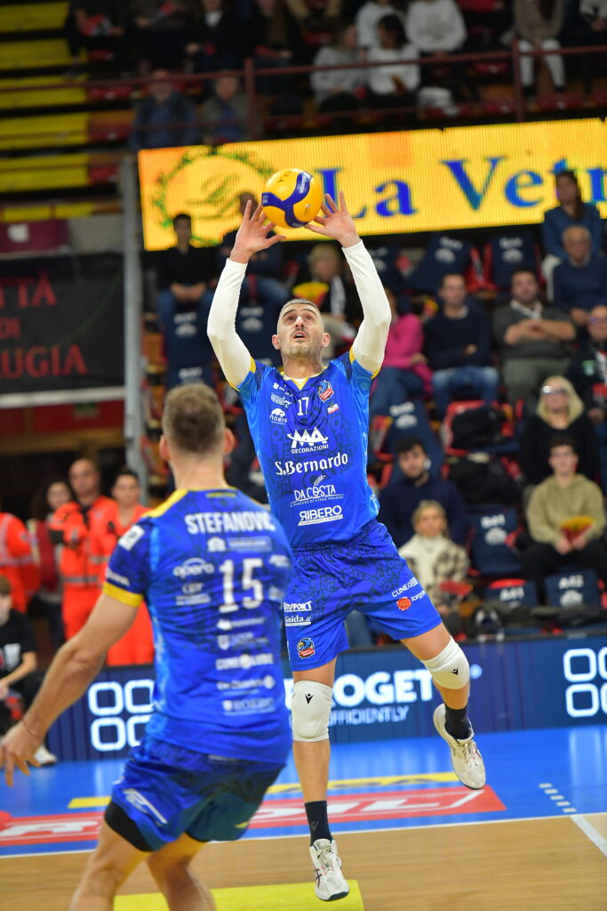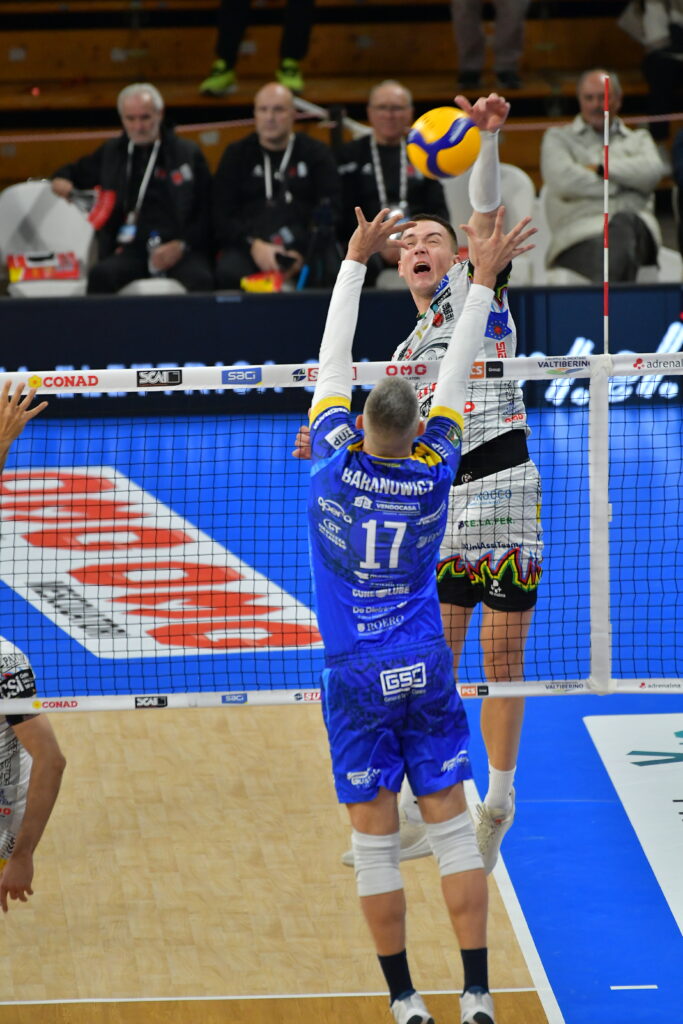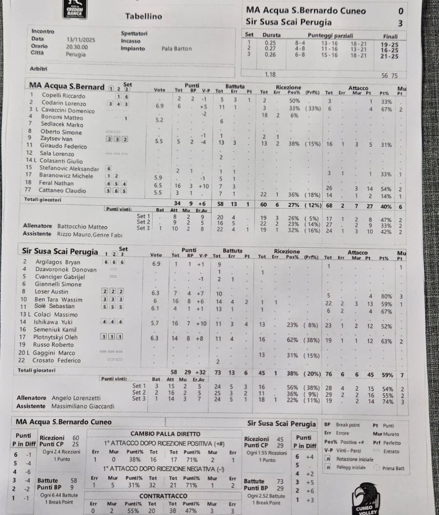 Serata tostissima per la MA S. Bernardo Cuneo, che oggi (13 novembre) è scesa in campo al Pala Barton Energy contro la Sir Susa Scai Perugia di coach Lorenzetti, squadra campione d’Europa e attualmente prima in classifica. I piemontesi partono senza Sedlacek (diventato papà per la seconda volta nei giorni scorsi) e durante il match devono fare i conti con le uscite di Stefanovic e Baranowicz. Anche Perugia si presenta leggermente rimaneggiata, ma non per questo meno agguerrita. Dopo un buon inizio, i biancoblù vengono rapidamente raggiunti dai padroni di casa, che avanzano senza indugi e lasciano poco scampo agli avversari, nonostante un terzo set più combattuto e i 16 punti di Feral.