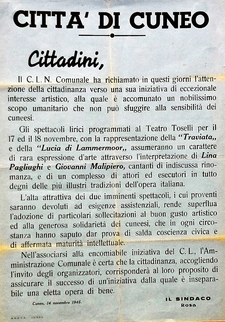 Con un manifesto del 14 novembre, il Sindaco Ettore Rosa informò i “Cittadini” che “Il CLN Comunale ha richiamato in questi giorni l’attenzione della cittadinanza verso una sua iniziativa di eccezionale interesse artistico, alla quale è accomunato un nobilissimo scopo umanitario che non può sfuggire alla sensibilità dei cuneesi.