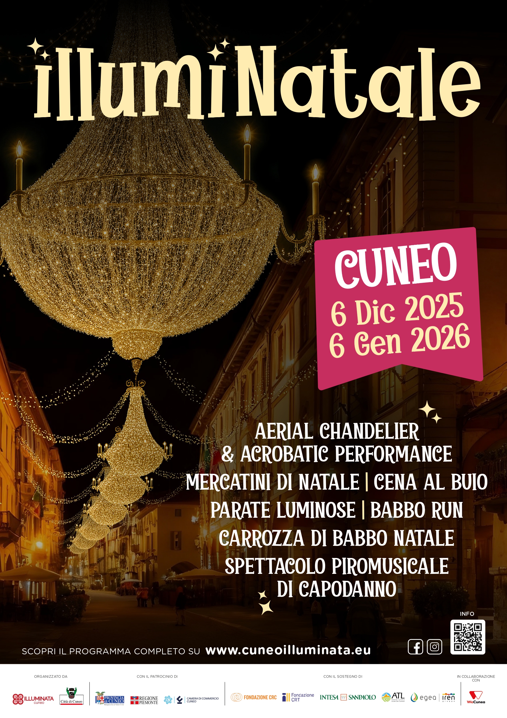 Tanti gli appuntamenti in programma per tutto il periodo delle festività. Tra le novità dell’edizione 2025, oltre al grande spettacolo inaugurale, la cena al buio di sabato 13 dicembre al ristorante Il Grill del Lovera, evento realizzato in collaborazione con l’U.N.I.Vo.C., associazione di volontari che collabora con l’Unione Italiana Ciechi ed Ipovedenti a cui andrà il ricavato della serata (55 euro a persona, prenotazioni al numero 0171-690420) e lo spettacolo piromusicale a tempo di musica in programma in piazza Galimberti per la sera di Capodanno.