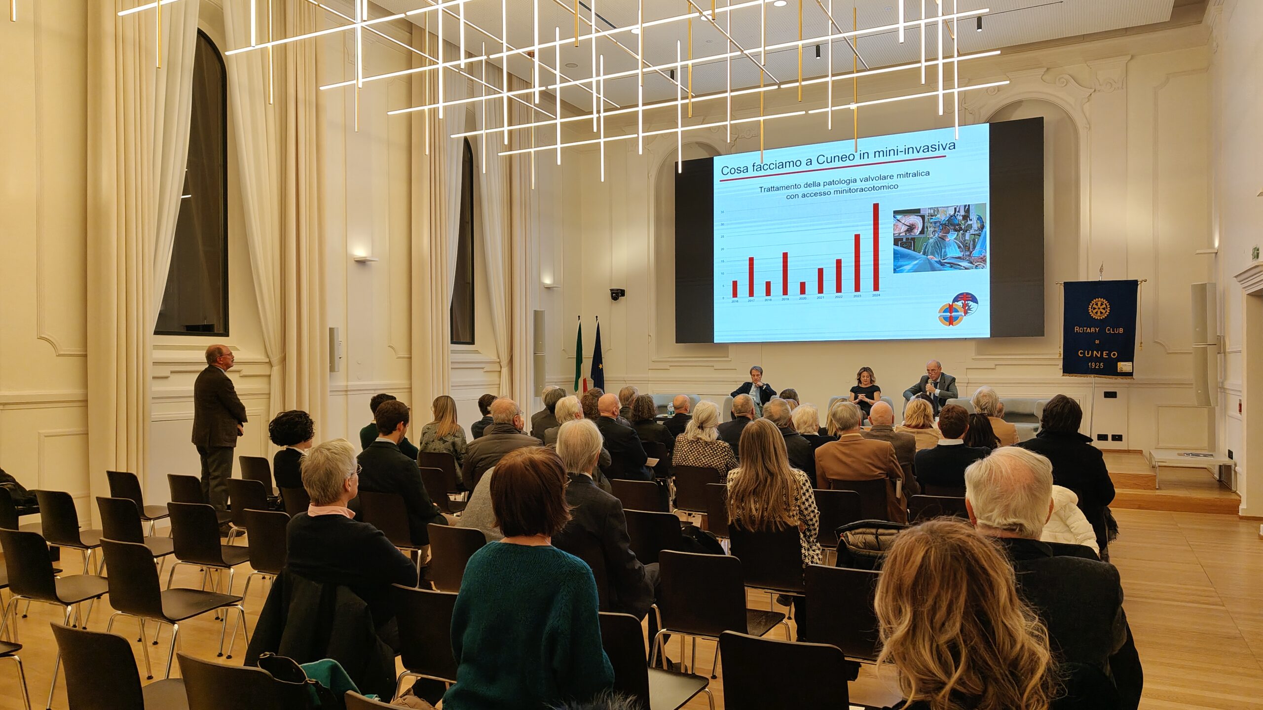 Dopo il saluto del presidente del Rotary Club Cuneo, Daniel Gallina, il Past President Luigi Fontana, medico specialista in malattie cardiovascolari e promotore dell’iniziativa, ha guidato gli interventi della serata. Le relazioni dei tre dirigenti hanno messo in luce l’eccellenza raggiunta dalla cardiochirurgia cuneese, oggi punto di riferimento regionale per la gestione delle patologie cardiovascolari più complesse.