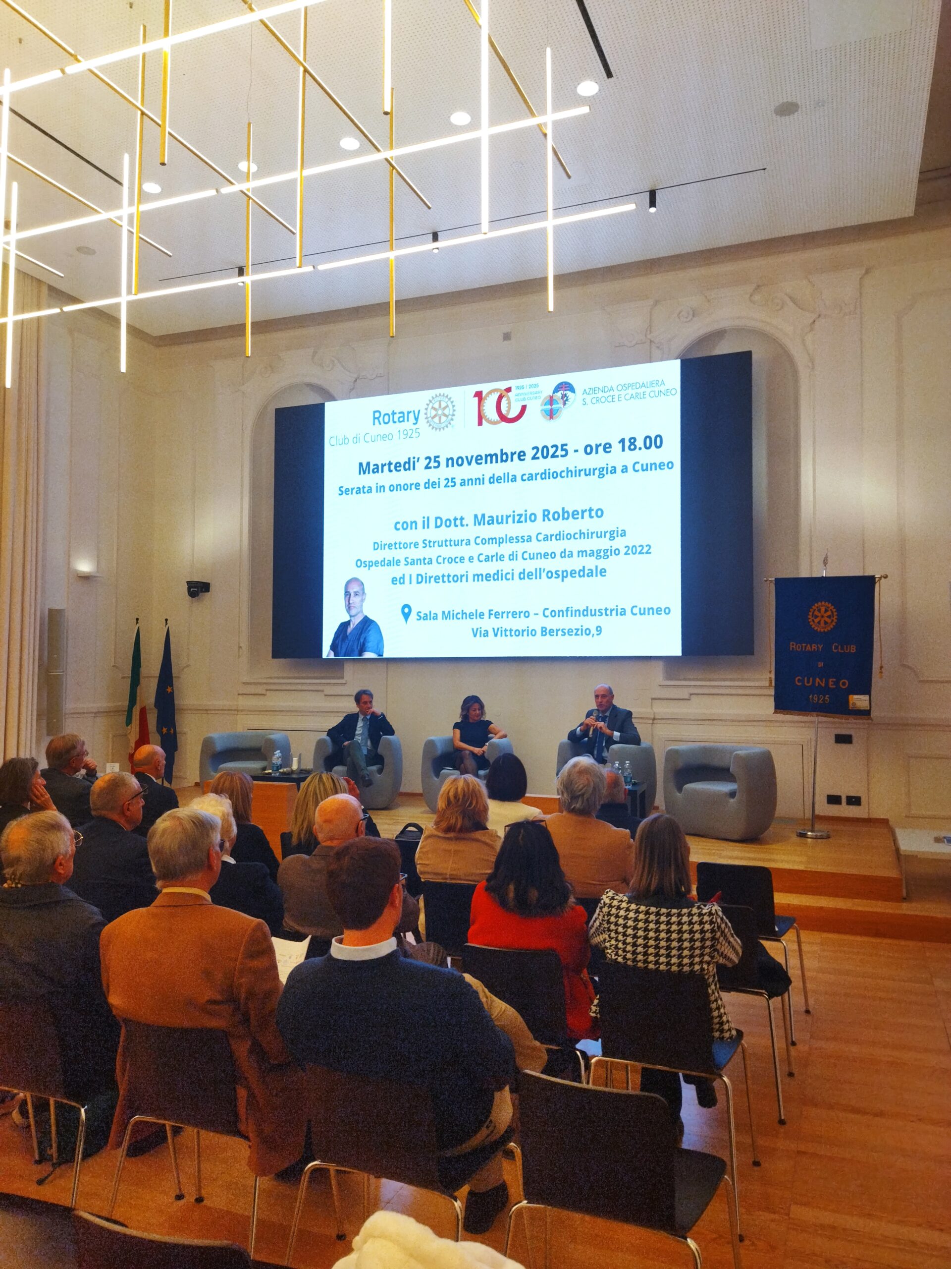 Nella sala “Michele Ferrero” di Confindustria Cuneo si è svolto un incontro riservato ai soci del Rotary Club Cuneo 1925 e ai loro ospiti, pensato come anteprima dell’evento celebrativo dedicato ai 25 anni della Cardiochirurgia dell’Ospedale Santa Croce e Carle, che si terrà il prossimo 12 dicembre presso lo Spazio della Fondazione CRC di via Roma.