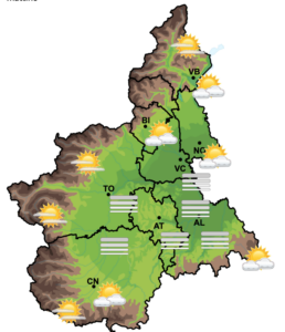 Un peggioramento è atteso nel corso della giornata di lunedì, con precipitazioni che diverranno via via più diffuse in serata e nella notte su martedì, moderate sul basso Piemonte e localmente forti sui rilievi del Cuneese e al confine con la Liguria, con una quota neve che si porterà mediamente sui 300-500 m a fine giornata di lunedì, localmente sui 200 m sul settore sudorientale, in ulteriore calo nella notte tra lunedì e martedì. Un miglioramento è atteso dalla tarda mattinata di martedì a partire dalle vallate tra Alpi Cozie e Marittime.