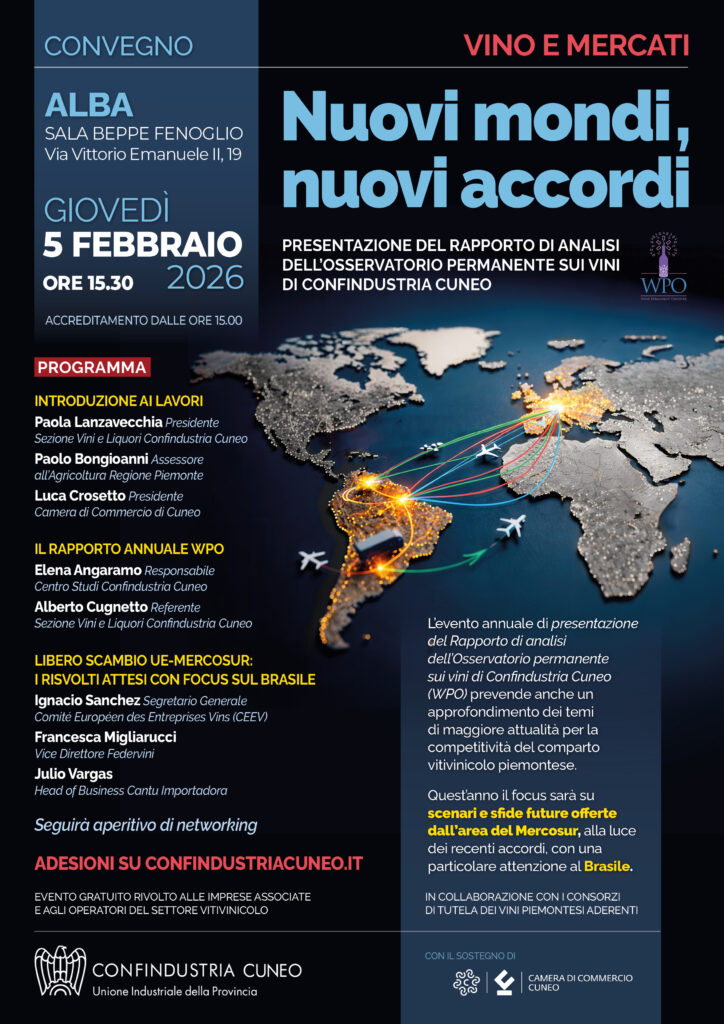 Il vino al centro dello scacchiere internazionale: giovedì 5 febbraio, a partire dalle 15.30, la Sala Beppe Fenoglio di Alba ospiterà l’edizione 2026 di “Vino e mercati. Nuovi mondi, nuovi accordi”, l’appuntamento annuale organizzato da Confindustria Cuneo per presentare i dati elaborati dal Wine Permanent Observer (Wpo), il centro studi permanente dedicato al comparto vitivinicolo.