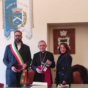 Prima della celebrazione della messa nella chiesa parrocchiale, si è svolto un momento di scambio di doni: l’amministrazione ha omaggiato il vescovo con un crocifisso realizzato dalla ceramista Aurora Vena. All’uscita dal municipio erano presenti i membri delle Confraternite di San Rocco e dell’Annunziata, la banda musicale, oltre alle autorità civili e militari. Il corteo ha quindi accompagnato il vescovo fino alla chiesa per la celebrazione eucaristica. Al termine, il corteo si è diretto verso il cimitero, dove si è tenuto un momento di preghiera in suffragio dei defunti. La giornata proseguirà nel pomeriggio e si concluderà alle ore 18 con l’incontro con le associazioni del territorio.