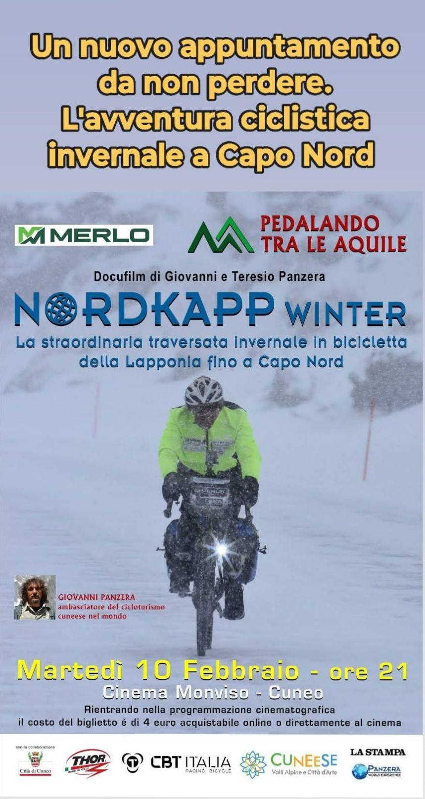 Nella serata di oggi, martedì 10 febbraio, al Cine Monviso di Cuneo a partire dalle ore 21 i fratelli Panzera presentano il docufilm “Nordkapp winter, la straordinaria traversata invernale in bicicletta della Lapponia fino a Capo Nord. Il biglietto di ingresso è di 4 euro, con possibilità di prenotazione on line oppure acquisto direttamente in cassa.