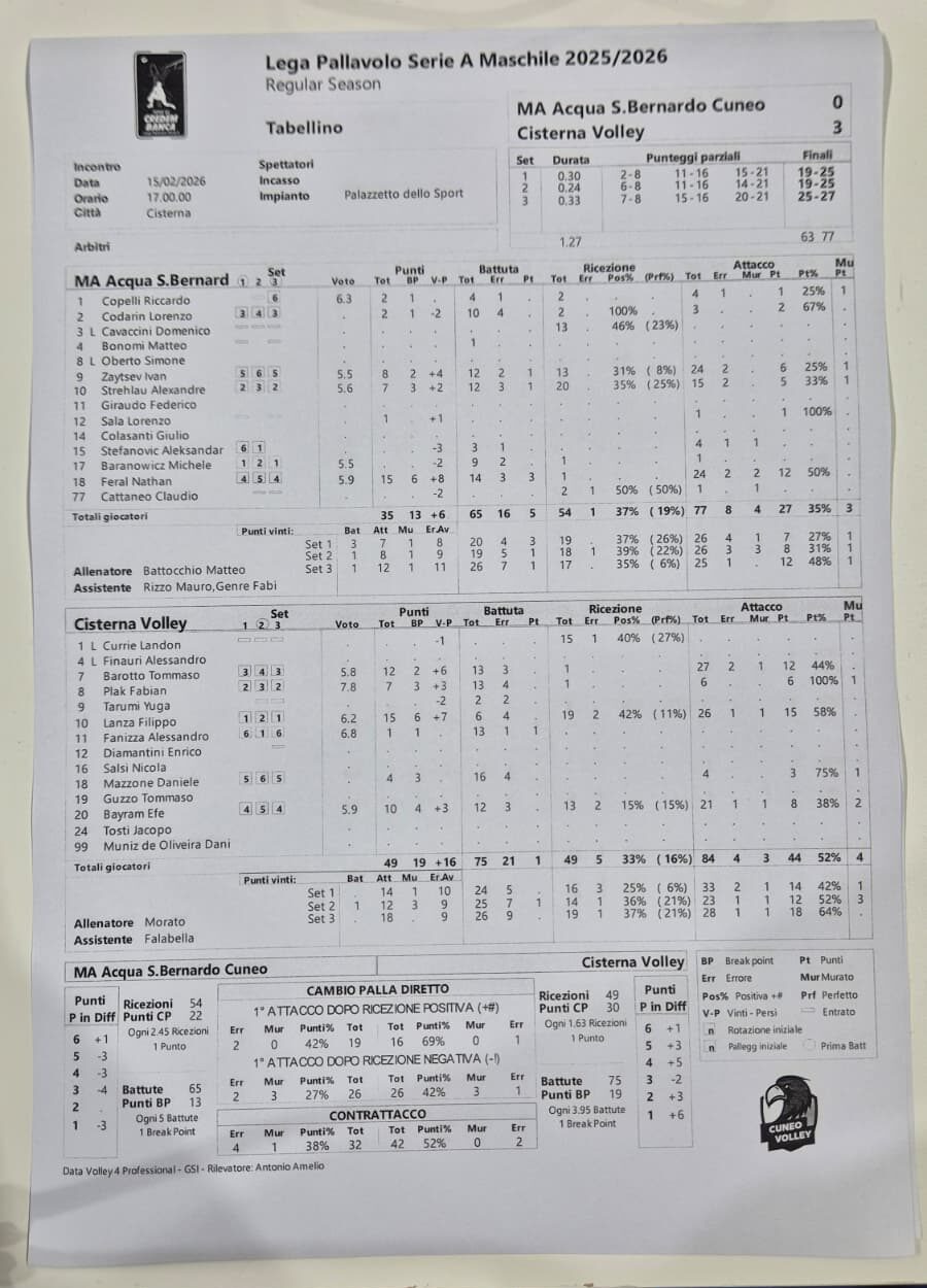 Cuneo scivola così al penultimo posto con 14 lunghezze, seppur a pari punti proprio con Cisterna che ora è al 10° posto: poco male, entrambe le formazioni sono salve e accederanno ai play-off per il 5° posto. Nel frattempo, domenica 22 febbraio alle 18 i biancoblù ospiteranno Padova per l’ultima sfida casalinga della regular season.